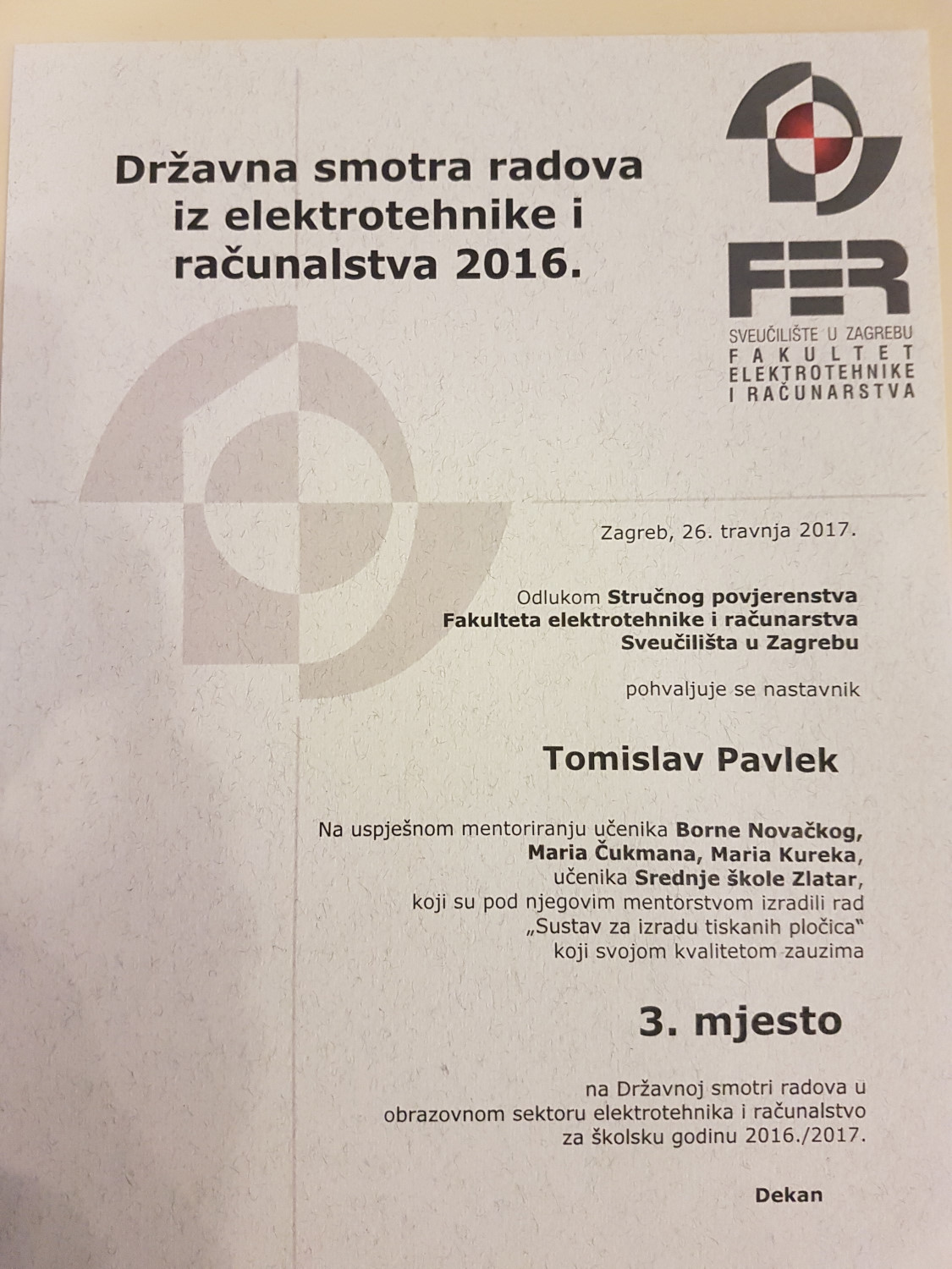 26. travnja 2017. je održana Državna smotra radova iz elektrotehnike i računalstva u organizaciji Agencije za strukovno obrazovanje i obrazovanje odraslih na Fakultetu elektrotehnike i računarstva. Našu školu predstavljali su učenici 4.r razreda, odnosno tehničari za računalstvo Borna Novački, Mario Čukman, Mario Kurek kao autori rada „Sustav za izradu tiskanih pločica“ i Filip Hubak uz pratnju i podršku mentora Tomislava Pavleka, struč.spec.ing.el. i nastavnika Srećka Svibna, dipl.ing. i Dubravka Čubeka, struč.spec.ing.el. Na smotri su prezentirana 63 rada, a rad naših učenika osvojio je izvrsno treće mjesto. Čestitke na prekrasnom rezultatu!