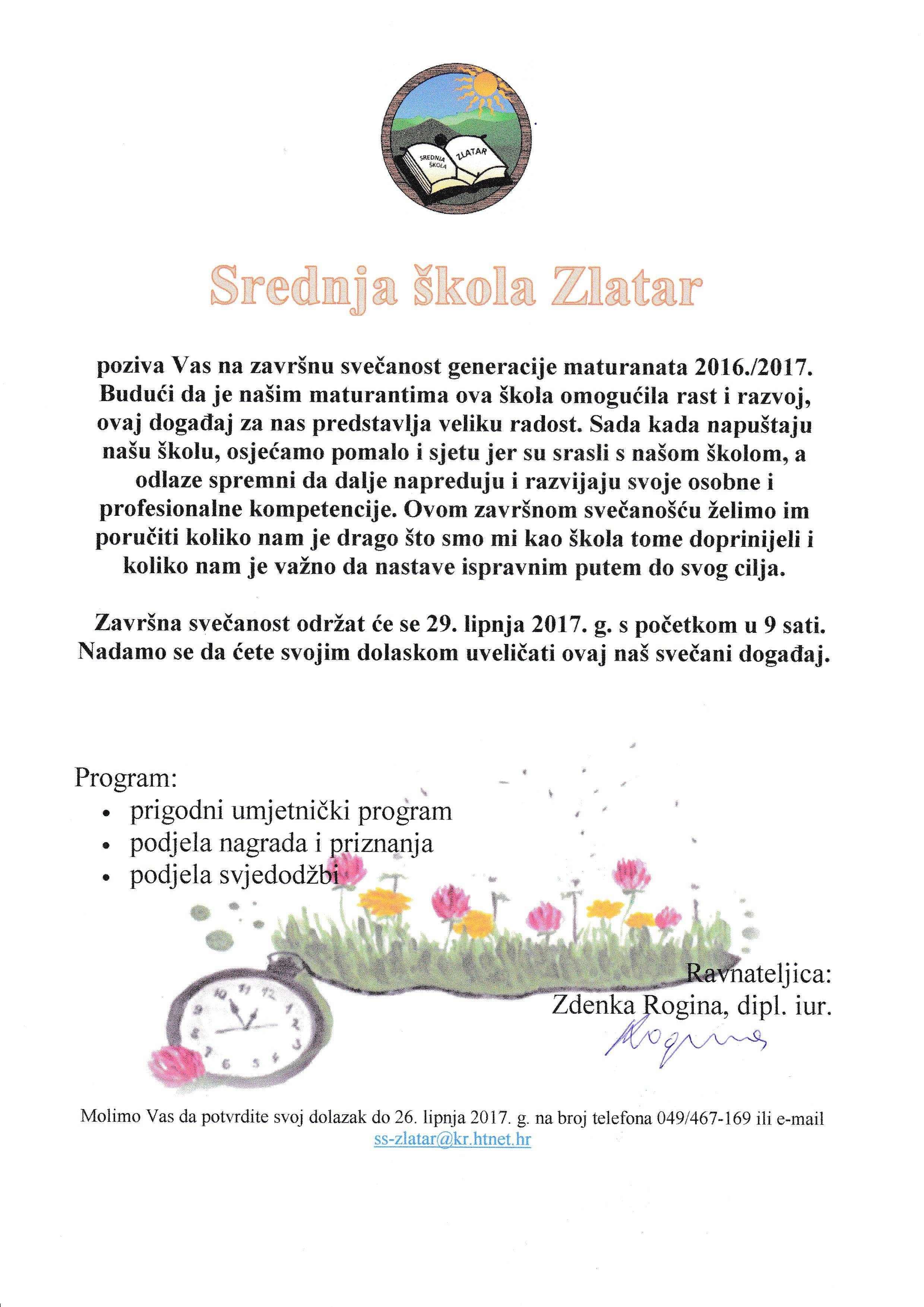 Dragi naši maturanti i učenici kojima će biti uručene nagrade za postignute uspjehe, Srednja škola Zlatar poziva vas i vaše roditelje na završnu svečanost maturanata generacije 2016./2017. koja će se održati 29. lipnja 2017. g. s početkom u 9.00 sati. S veseljem vas očekujemo!